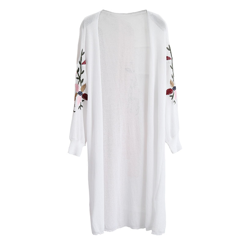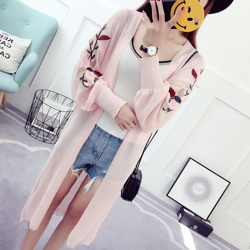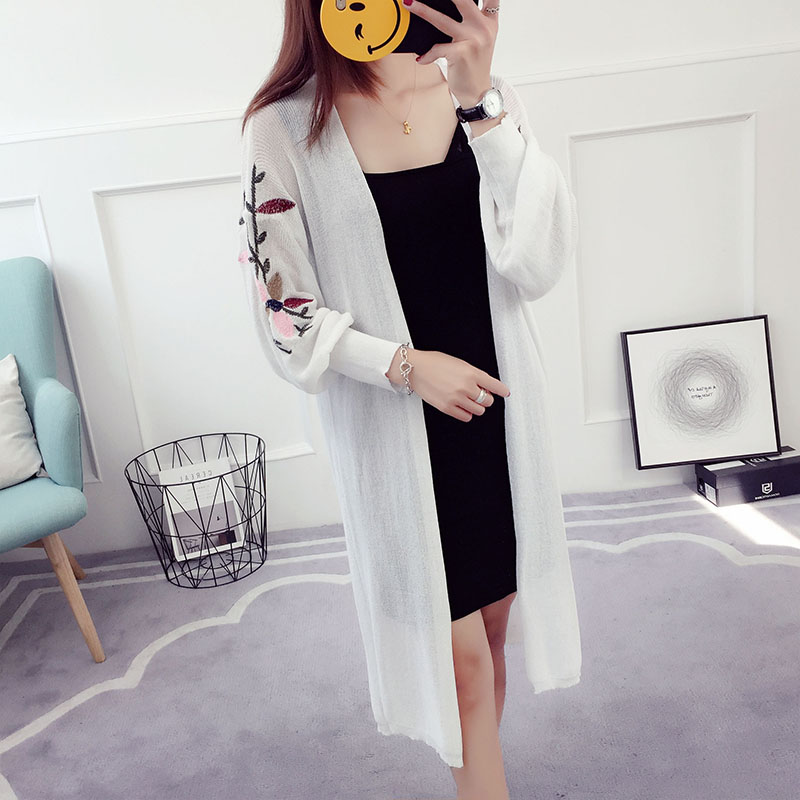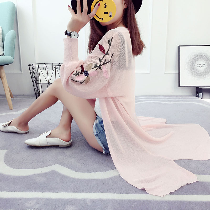 針織開衫女中長款長袖新款韓版防曬衫夏季薄款刺繡空調衫外套
