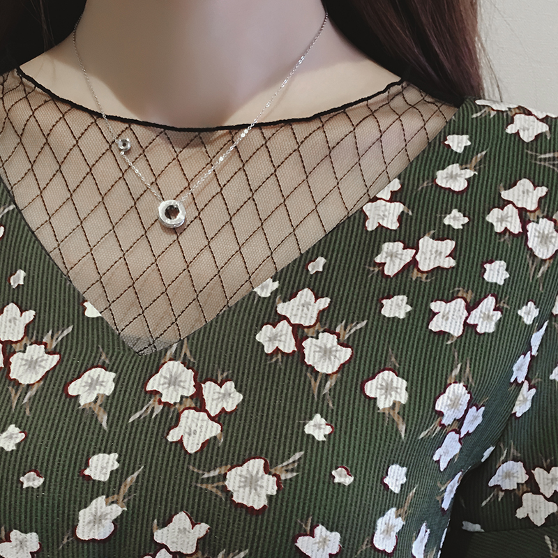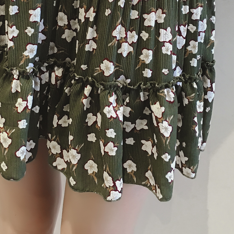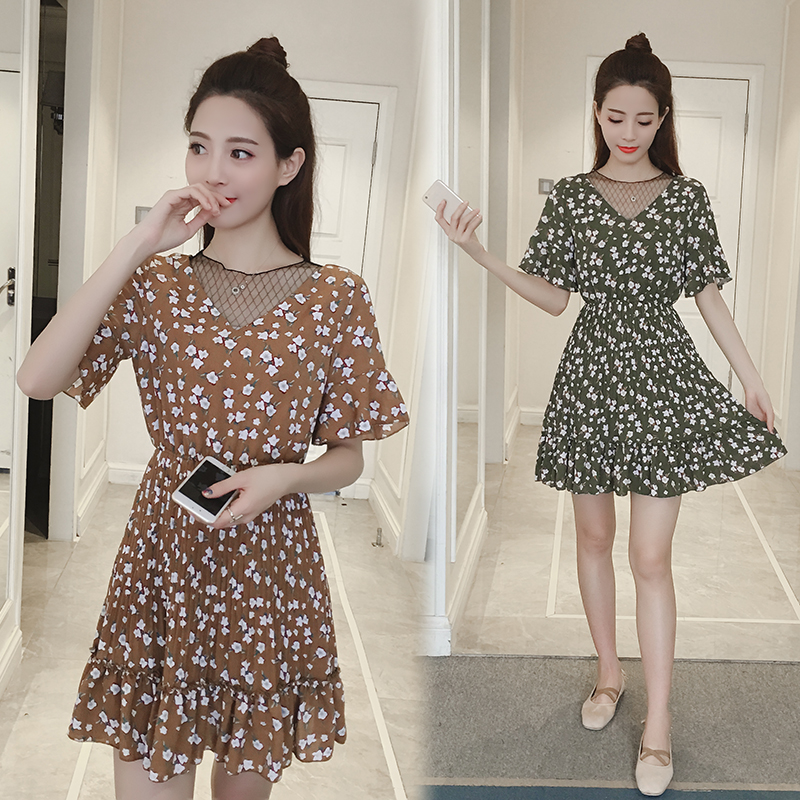 / 新款女裝網紗拼接V領百褶裙子女夏季收腰碎花短袖連衣裙