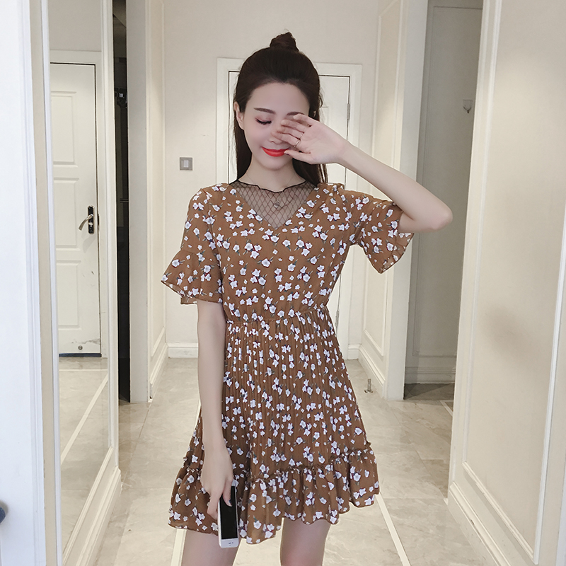 新款女裝網紗拼接V領百褶裙子女夏季收腰碎花短袖連衣裙