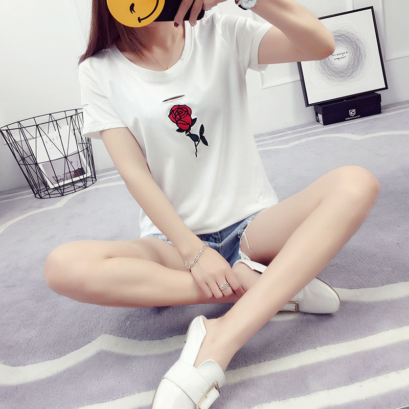 / 玫瑰刺繡t恤女短袖破洞半袖韓范夏裝新款韓版潮寬松百搭學生