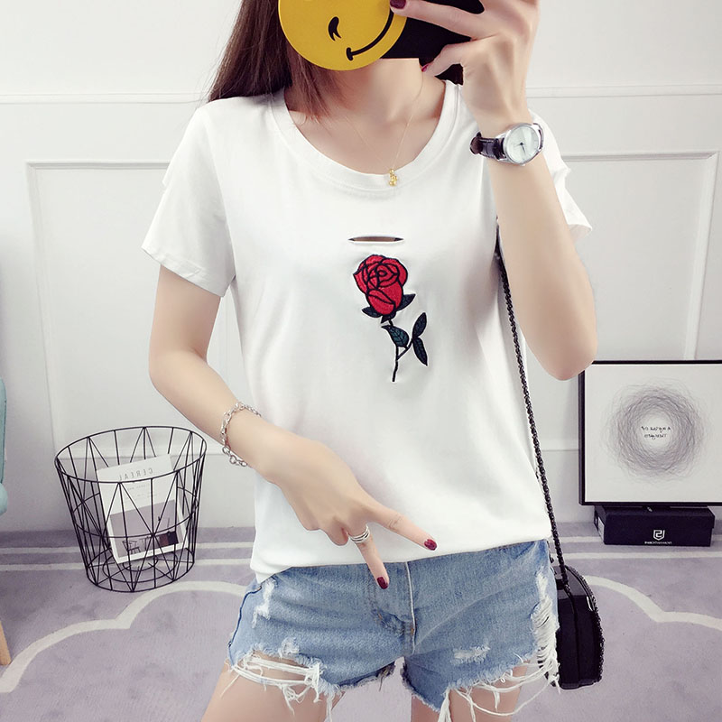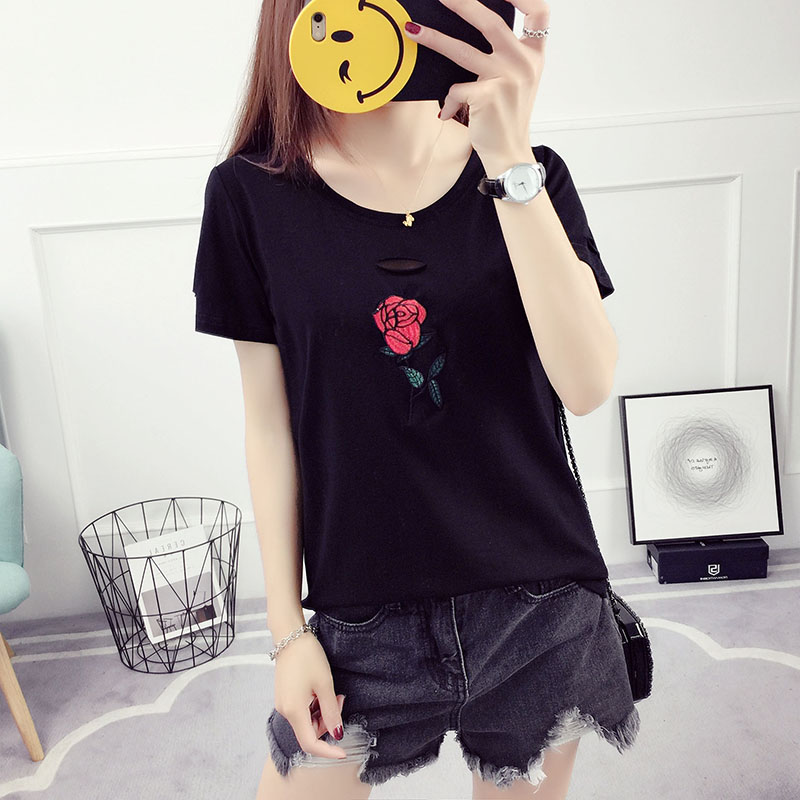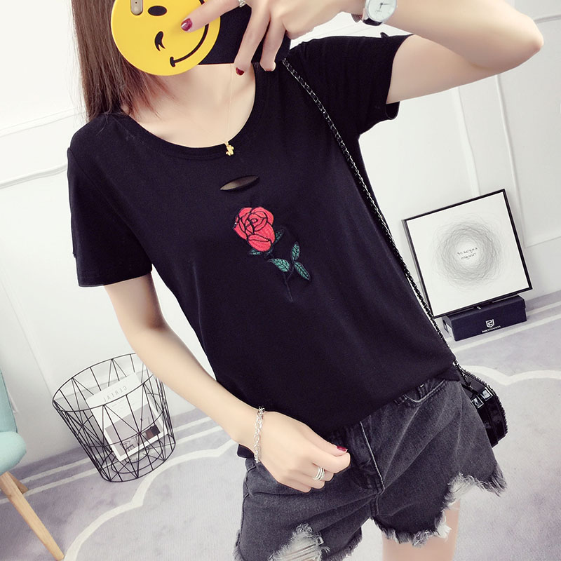 玫瑰刺繡t恤女短袖破洞半袖韓范夏裝新款韓版潮寬松百搭學生