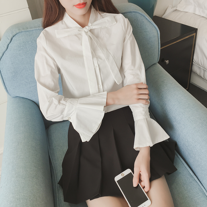 / 春新款女裝韓版蝴蝶結條紋襯衫女長袖雪紡襯衣喇叭袖百搭上衣