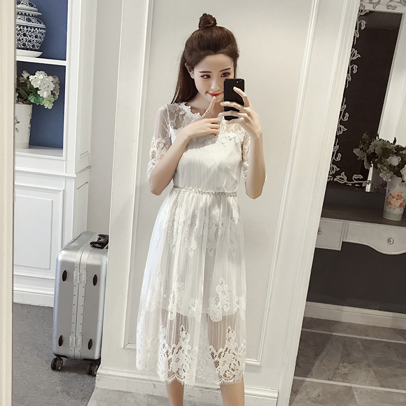 / 夏季新款女裝韓版中長款沙灘裙女修身收腰白色蕾絲短袖連衣裙