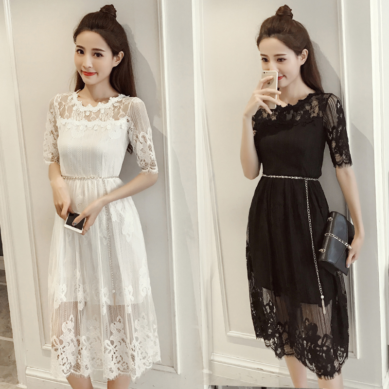 夏季新款女裝韓版中長款沙灘裙女修身收腰白色蕾絲短袖連衣裙