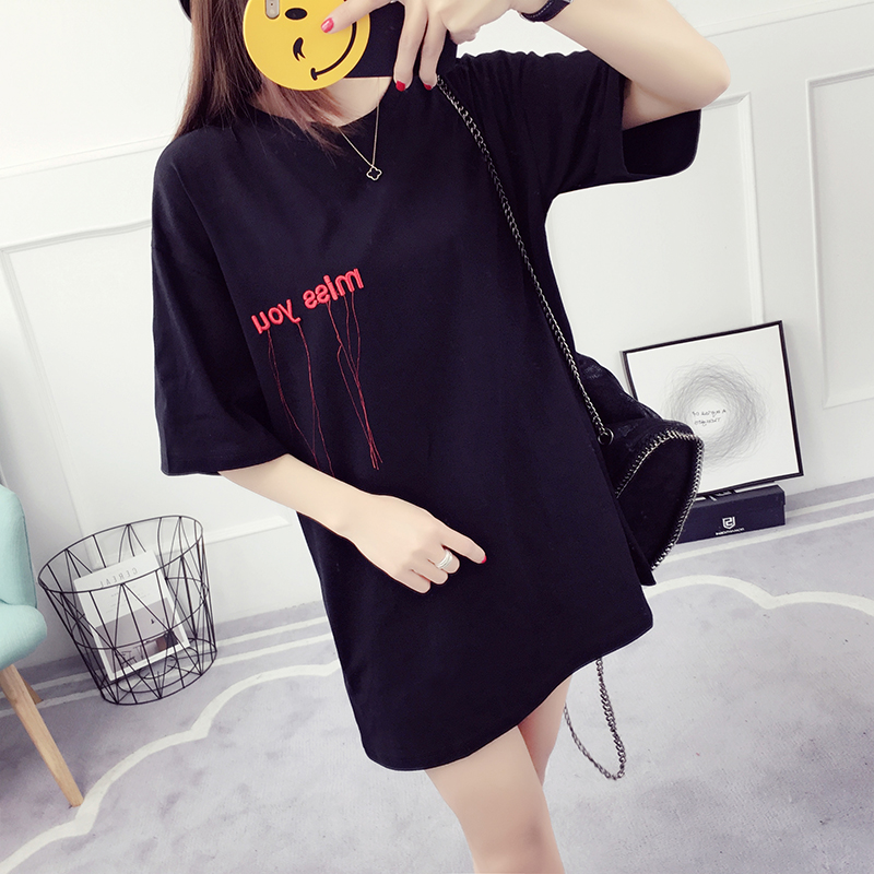 刺繡字母t恤夏季短袖女韓版潮寬松百搭學生中長款流蘇上衣打底衫