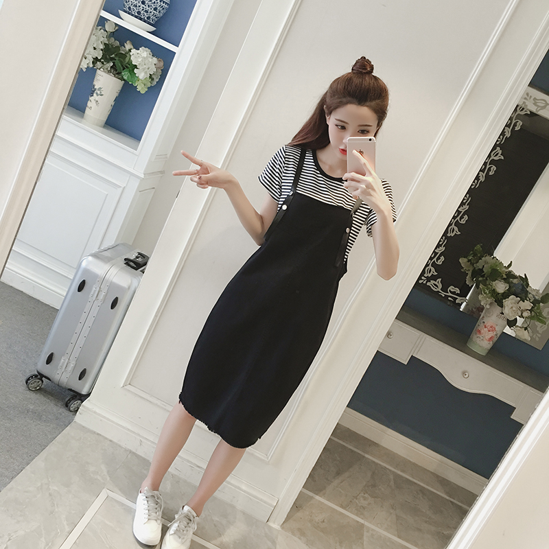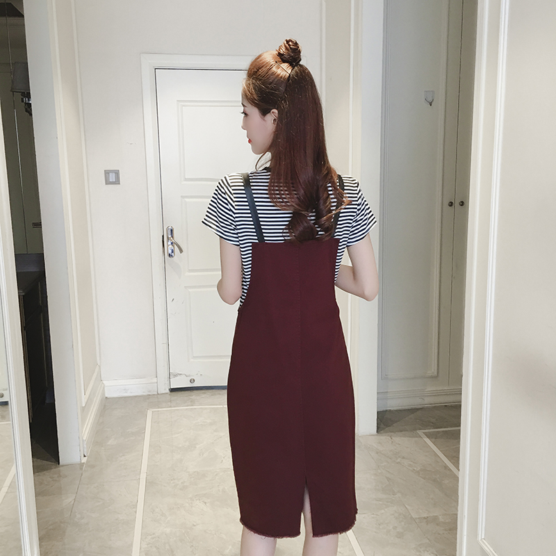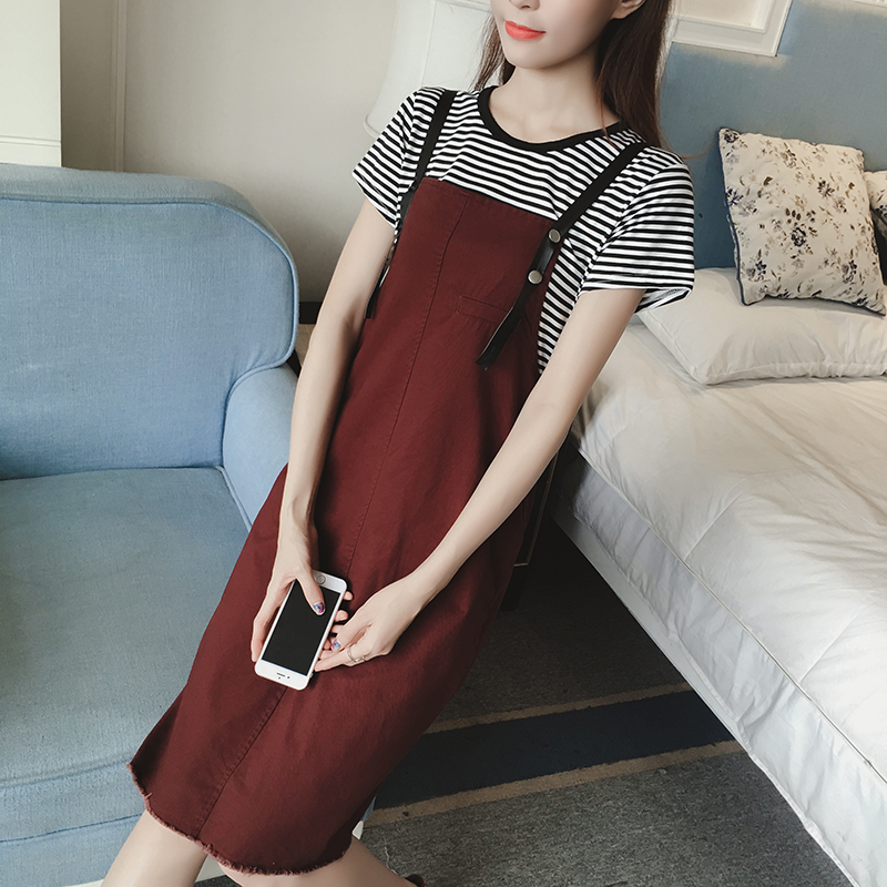 夏季新款女裝韓版牛仔背帶裙兩件套中長款寬松顯瘦短袖連衣裙