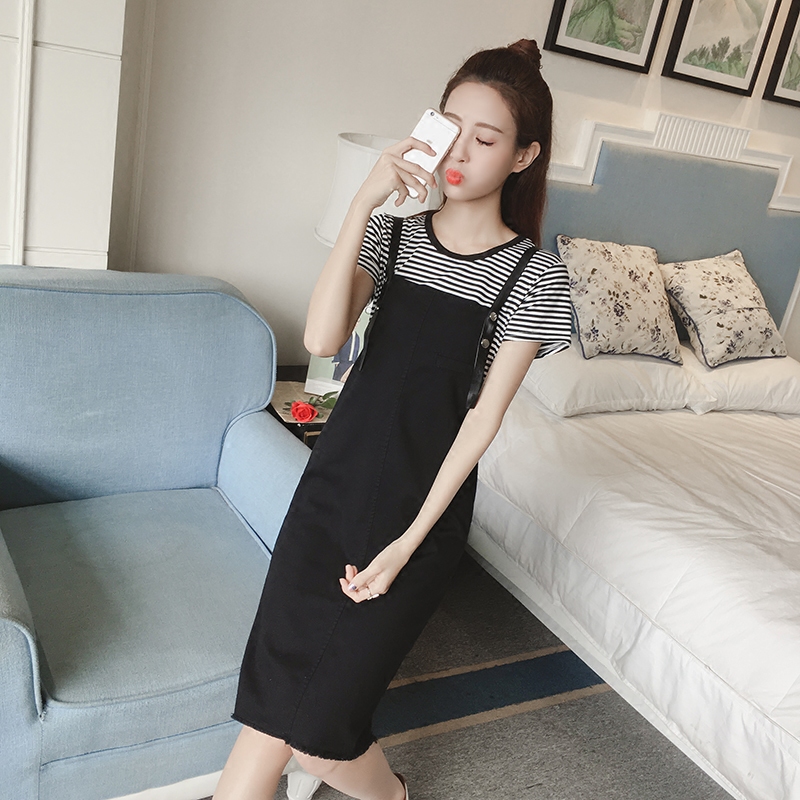 / 夏季新款女裝韓版牛仔背帶裙兩件套中長款寬松顯瘦短袖連衣裙