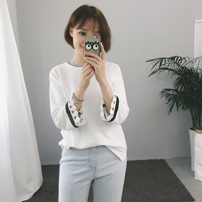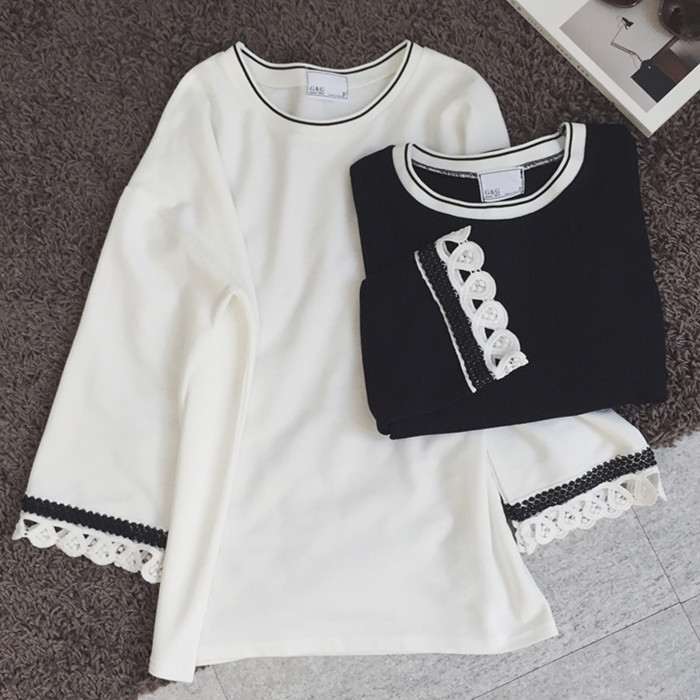 / 秋裝新款韓版百搭休閑寬松撞色領口拼接花邊袖上衣T恤女裝