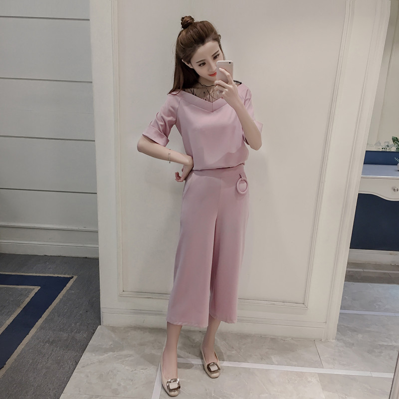 春夏季新款女裝時尚名媛氣質網紗拼接上衣休閑七分闊腿褲套裝