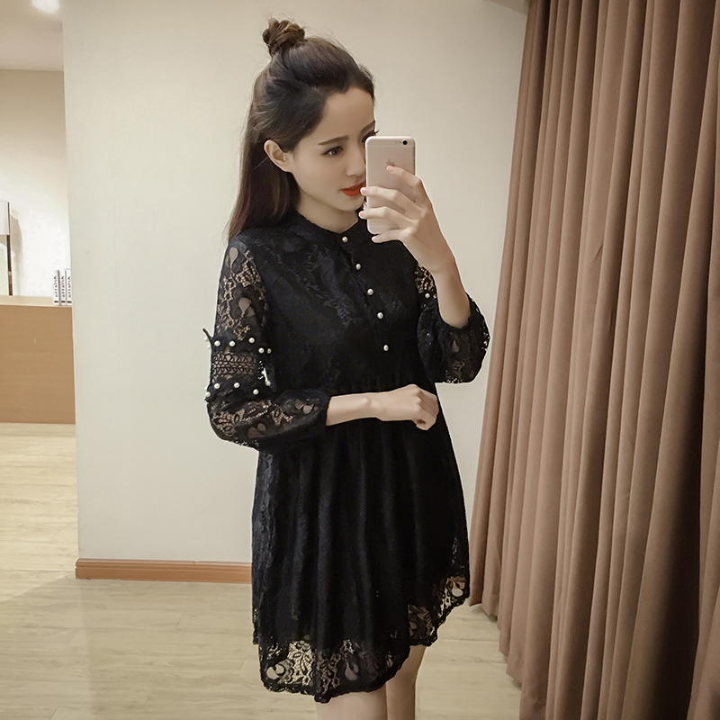 / 春裝新款女裝中長款燈籠袖打底裙寬松顯瘦鏤空蕾絲連衣裙春秋