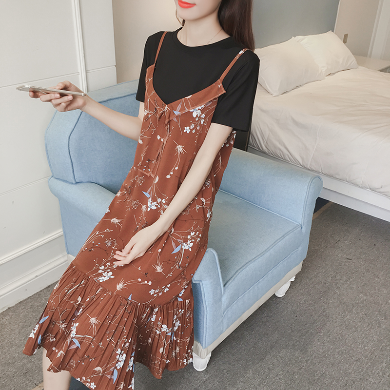 / 春裝新款女裝復古印花V領中長款顯瘦碎花雪紡吊帶連衣裙女夏