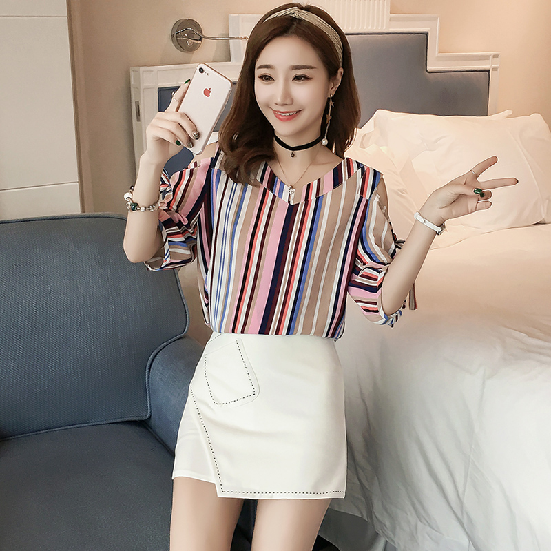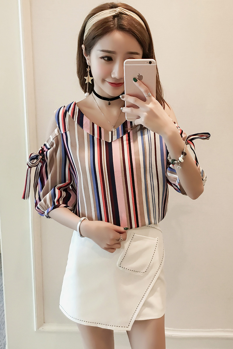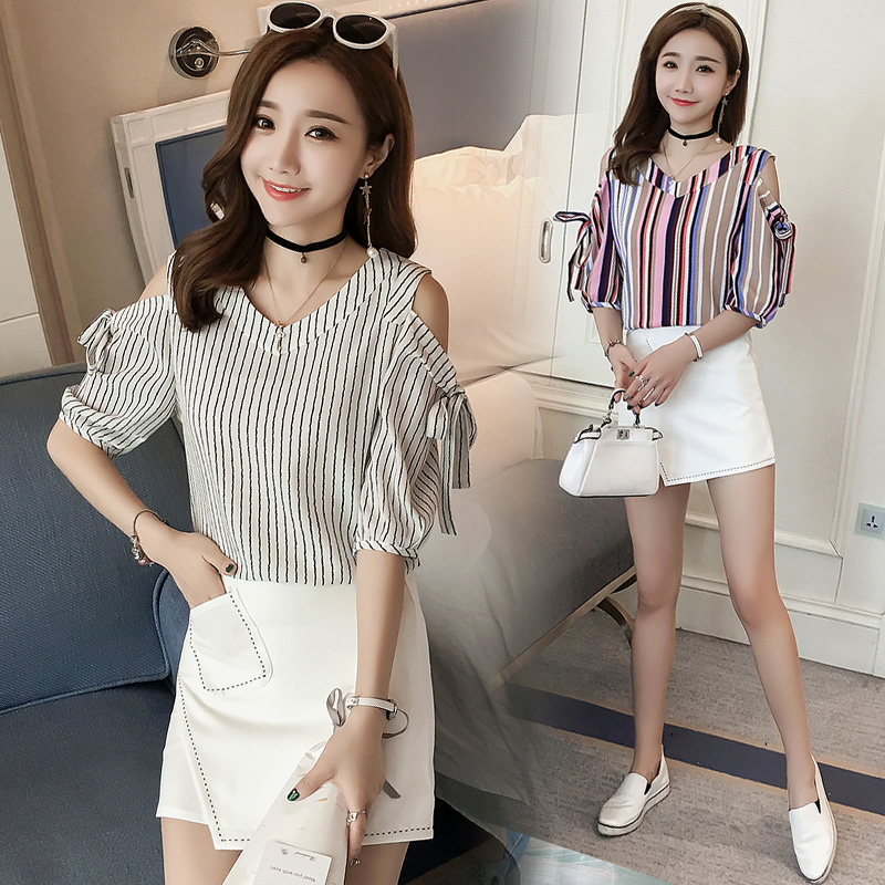 / 夏季新款女裝韓版條紋露肩雪紡衫套裝女休閑高腰半身短裙兩件套潮