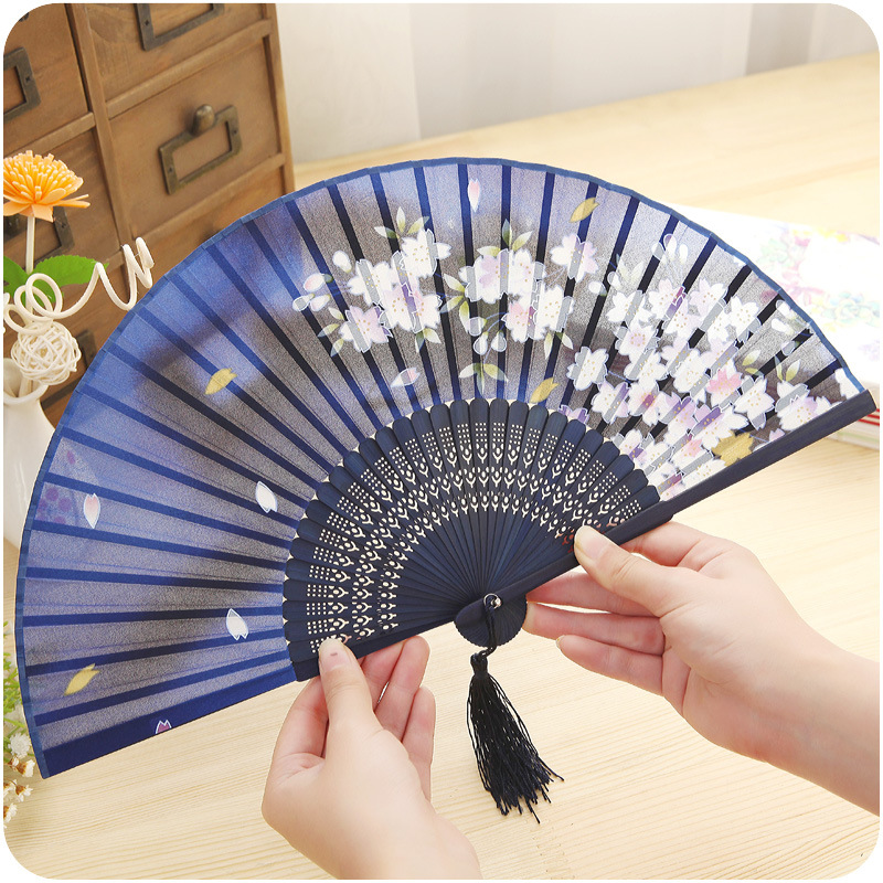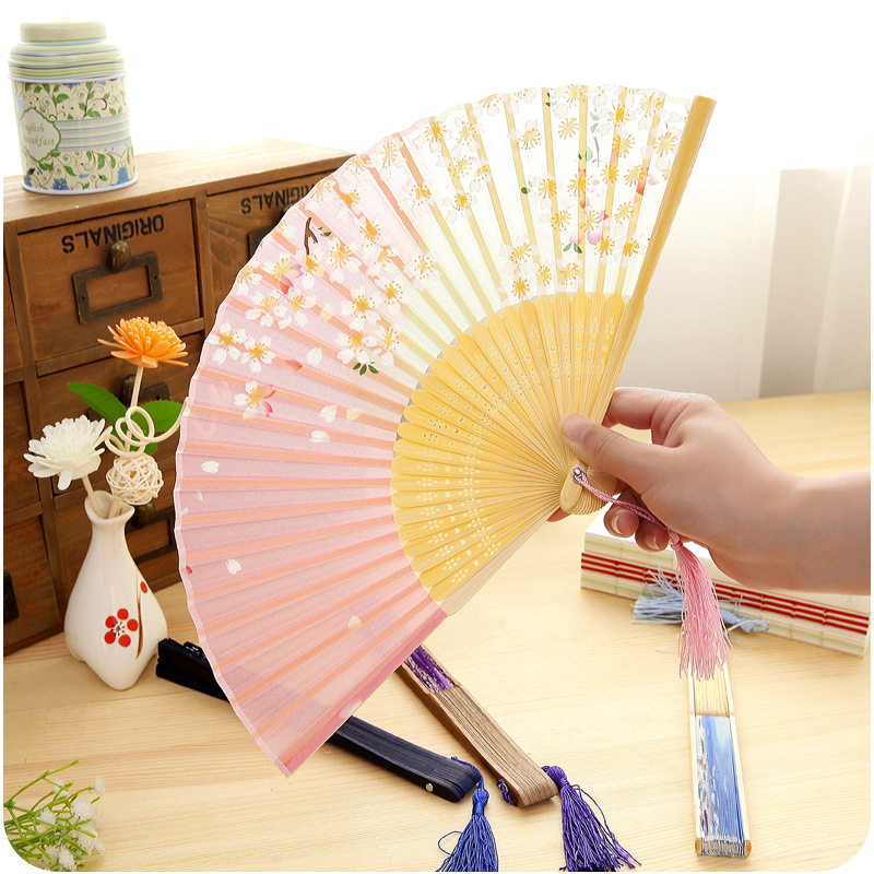 / 手工創意和風復古櫻花竹扇子夏季手搖帶穗子小扇古風真蠶絲折扇面