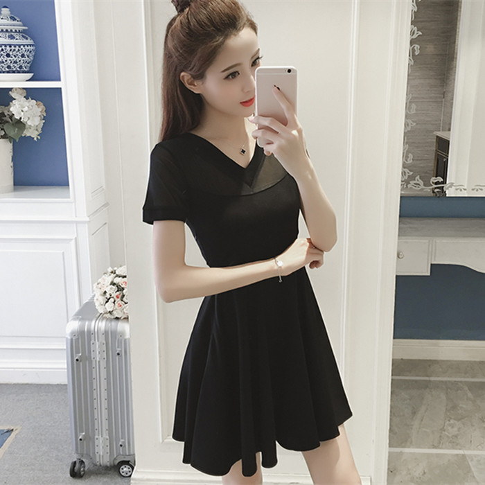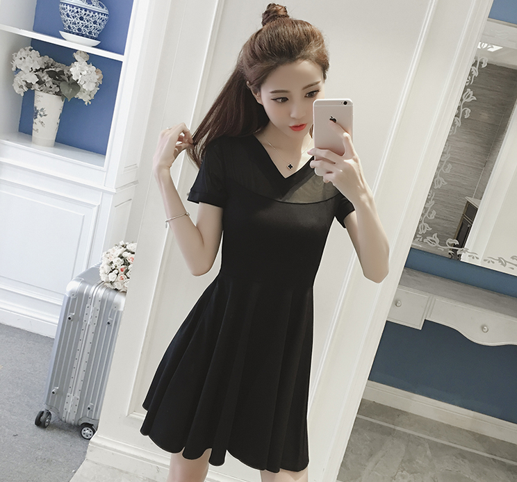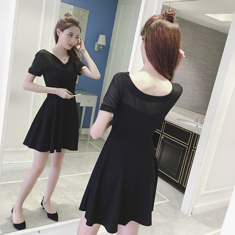 / 夏季新款女裝韓版網紗拼接兩穿打底小黑裙收腰顯瘦短袖連衣裙