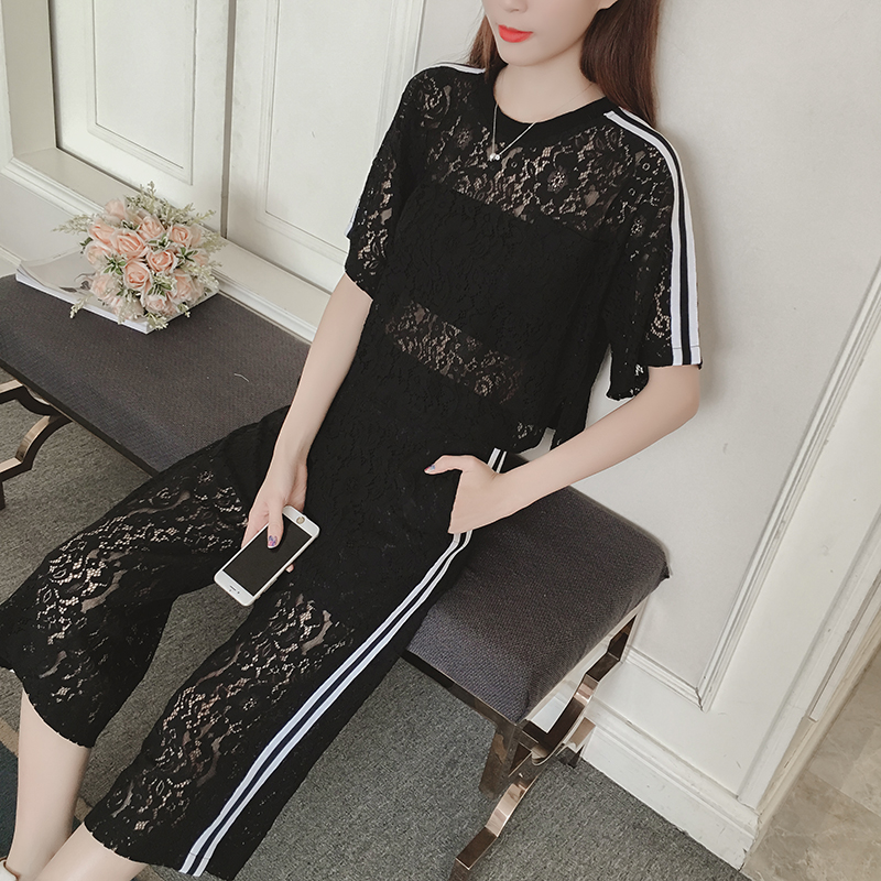 / 夏季新款女裝名媛氣質蕾絲衫上衣兩件套休閑七分闊腿褲套裝韓版潮