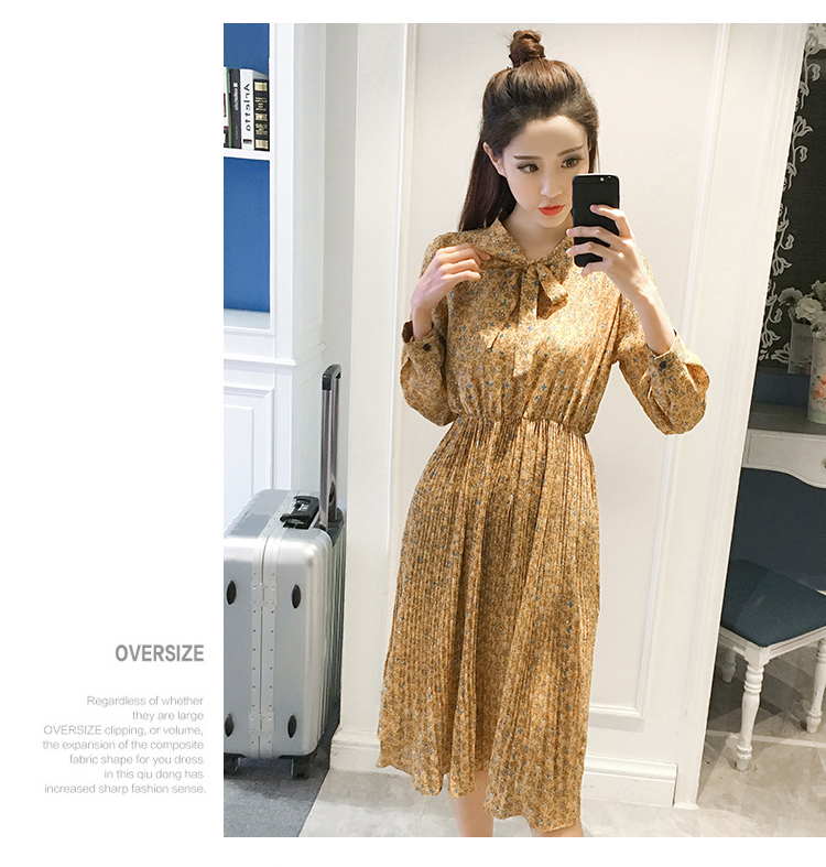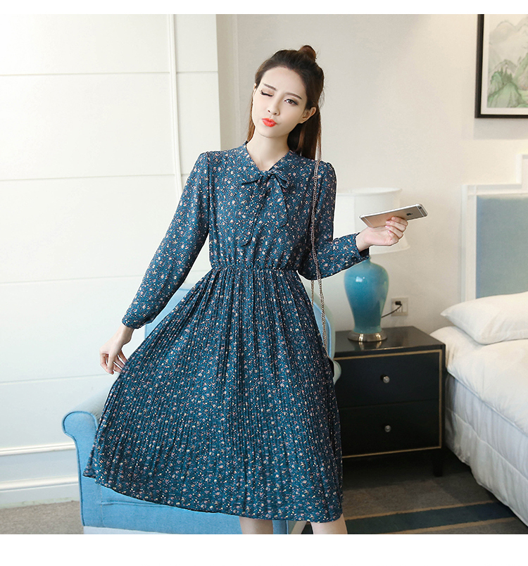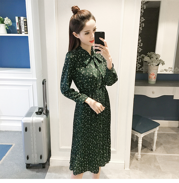 / 春秋裝新款女裝復古碎花中長款收腰顯瘦蝴蝶結雪紡長袖連衣裙