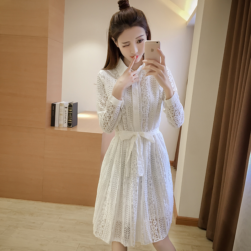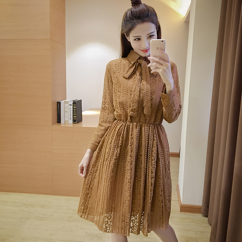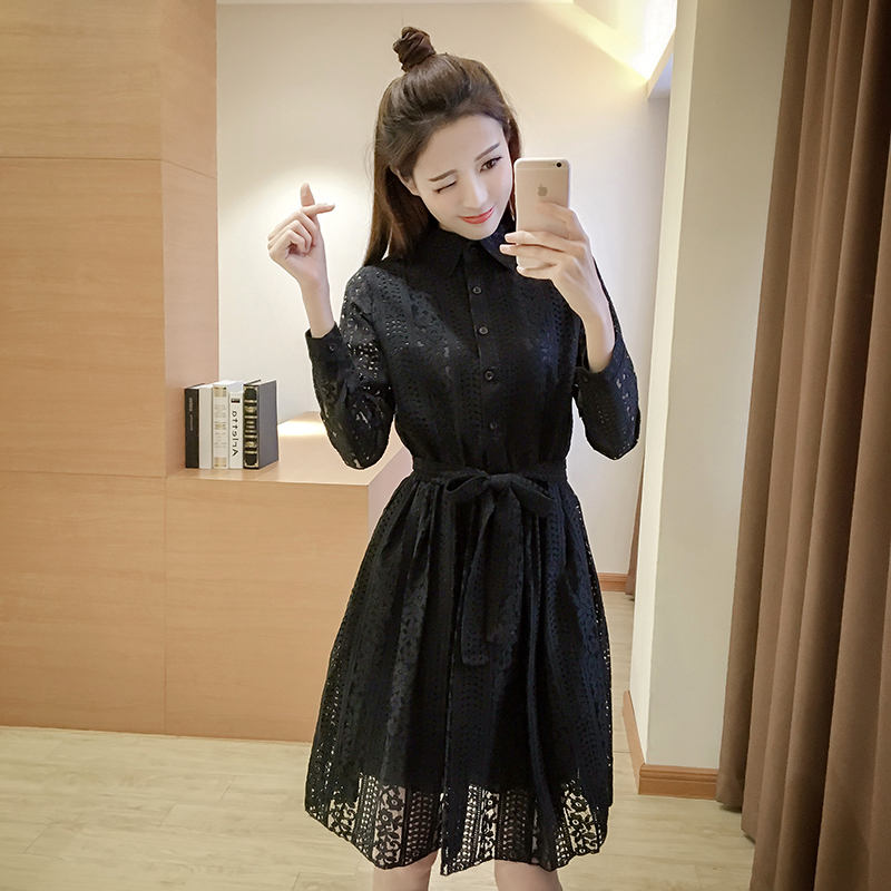 / 春新款女裝韓版中長款蕾絲打底裙修身收腰長袖襯衫連衣裙春秋