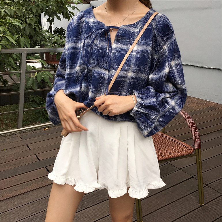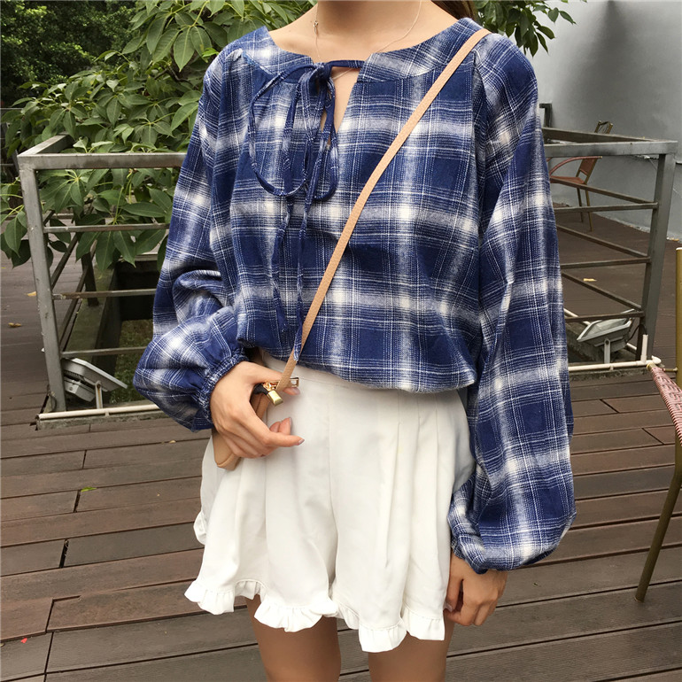 / 韓版寬松系帶女裝格子上衣外套秋冬學生新款套頭百搭長袖打底襯衫