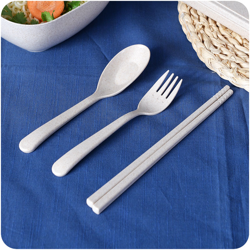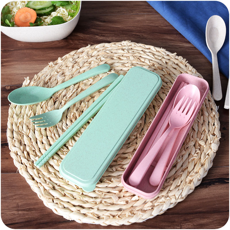 / 環保稈色叉子勺子三件套家用餐具套裝便攜旅行筷子學生精致盒裝