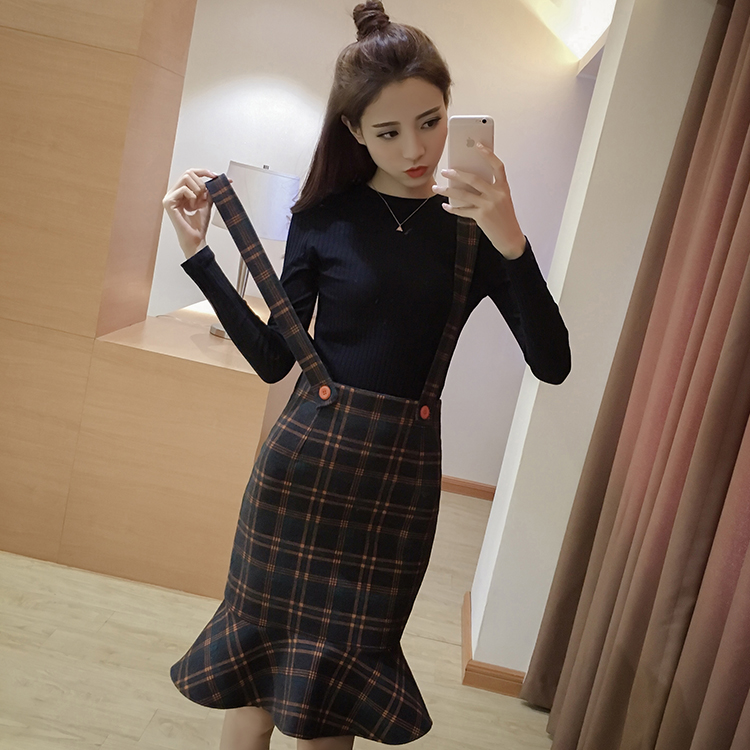 / 女裝秋冬季新款韓版背帶兩件套格子連衣裙修身包臀毛呢魚尾裙