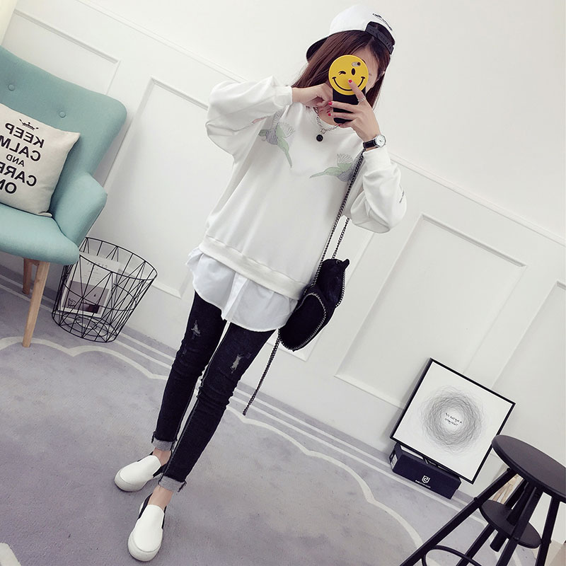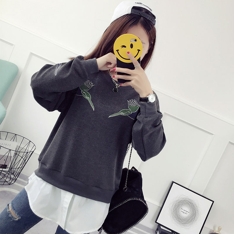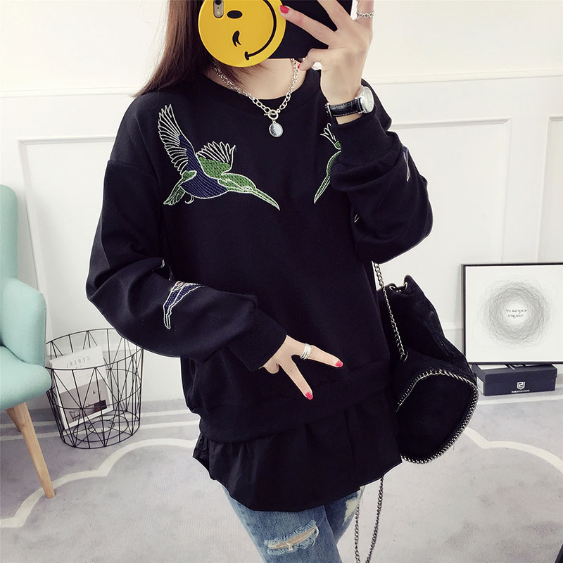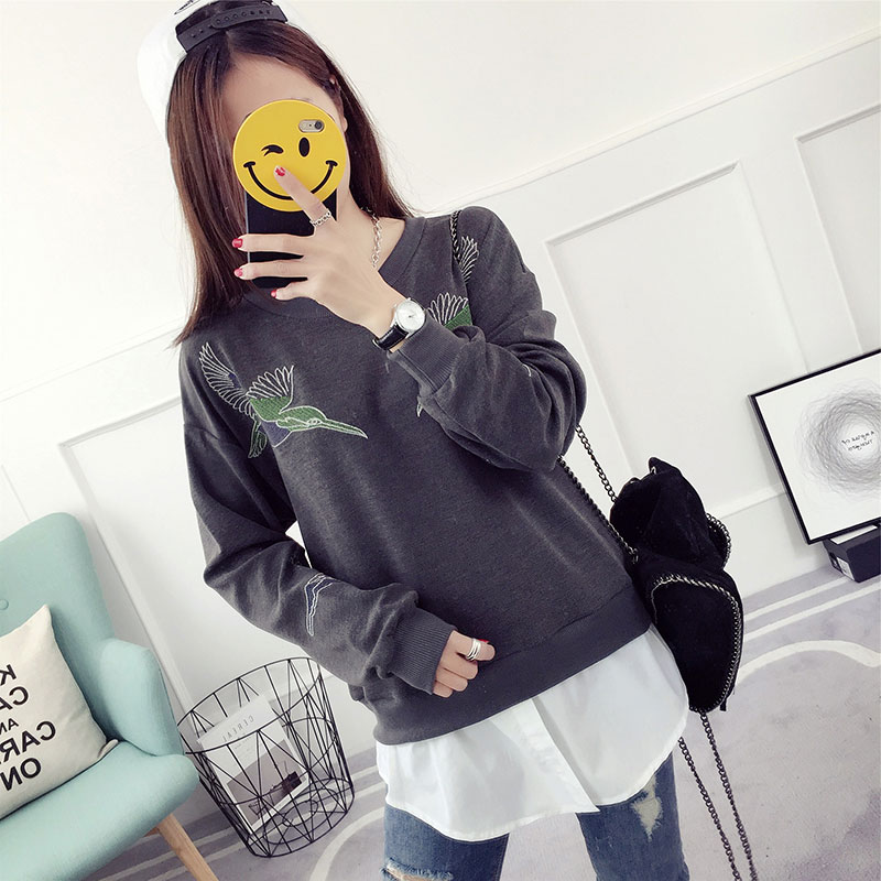 / 春季韓版潮學生寬松百搭圓領套頭bf中長款假兩件拼接刺繡衛衣女裝