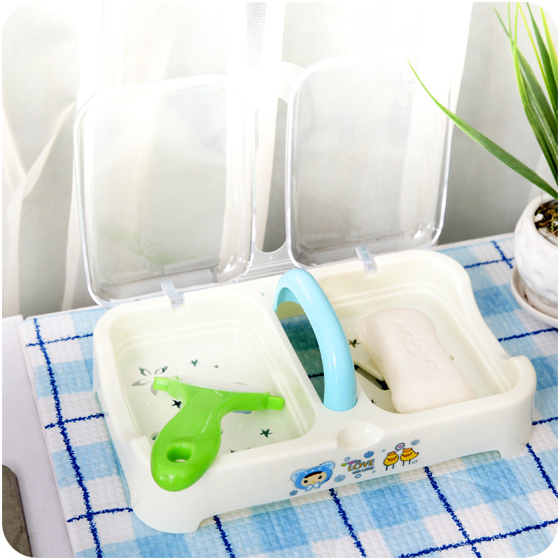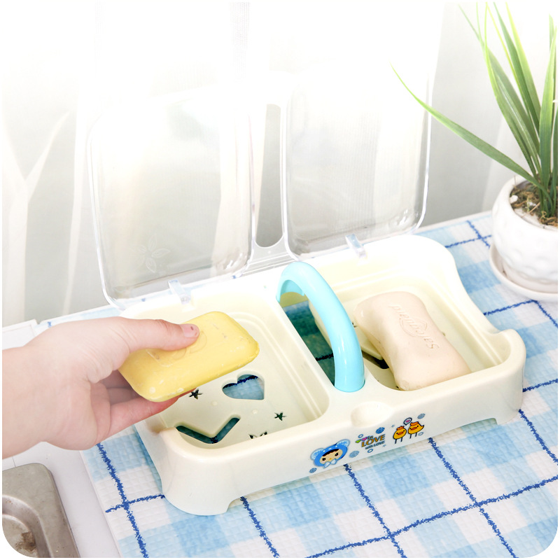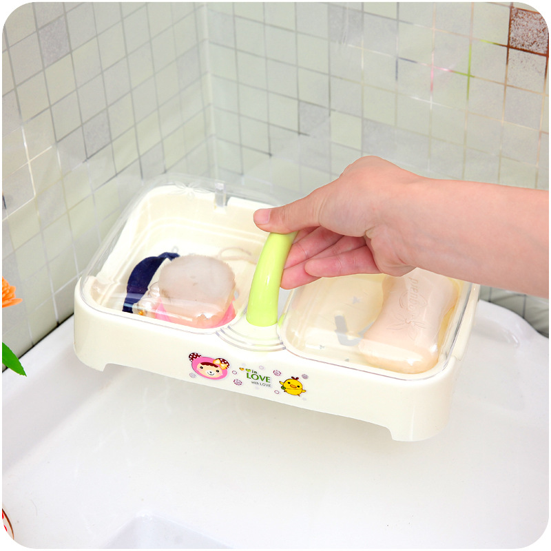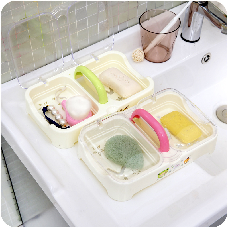 / 創意時尚精品塑料肥皂盒大號帶手提雙格瀝水肥皂架透明帶蓋香皂盒