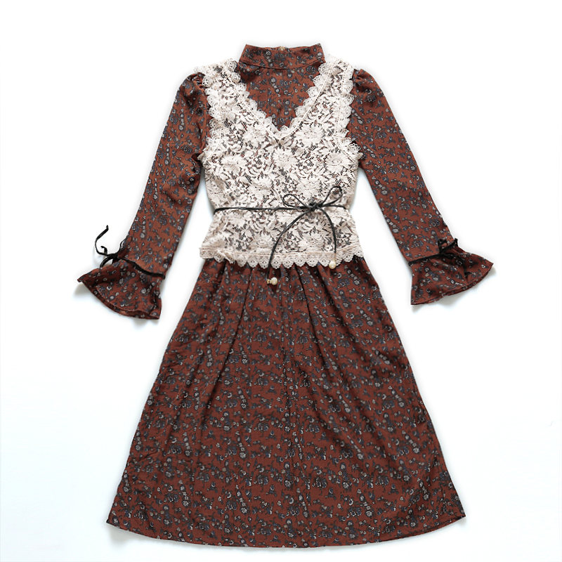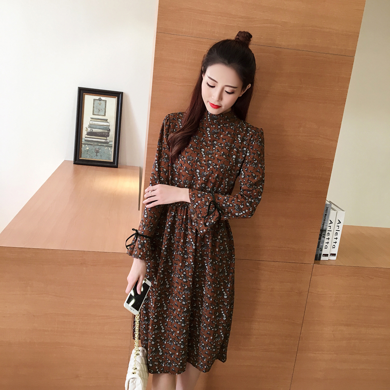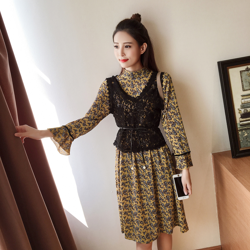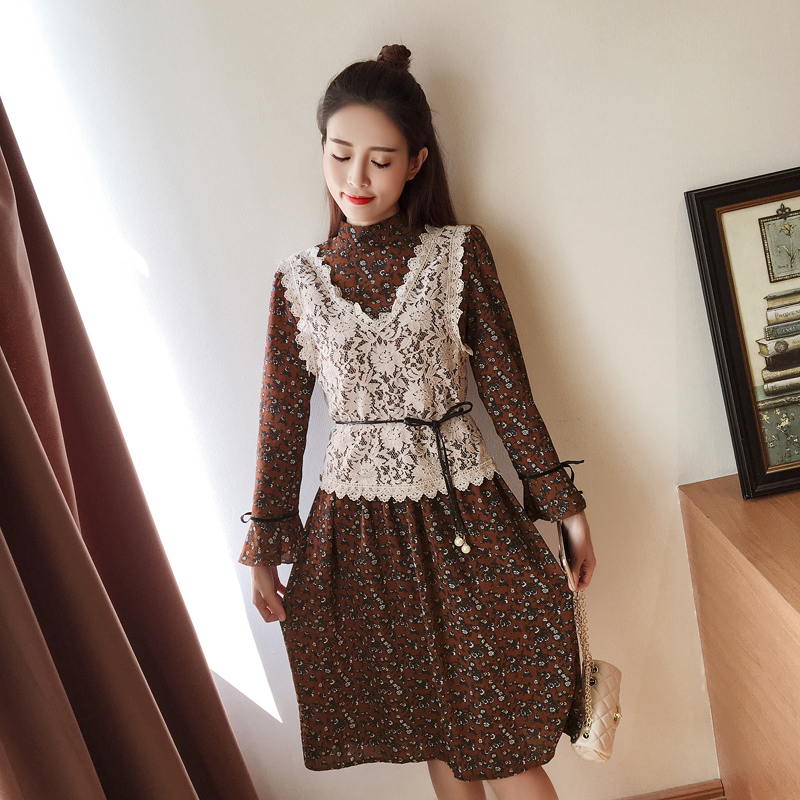 / 春新款女裝復古碎花中長款顯瘦長袖雪紡連衣裙套裝兩件套春秋