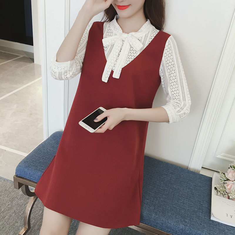 春裝新款韓版假兩件蕾絲拼接中長款寬松顯瘦七分袖連衣裙女夏
