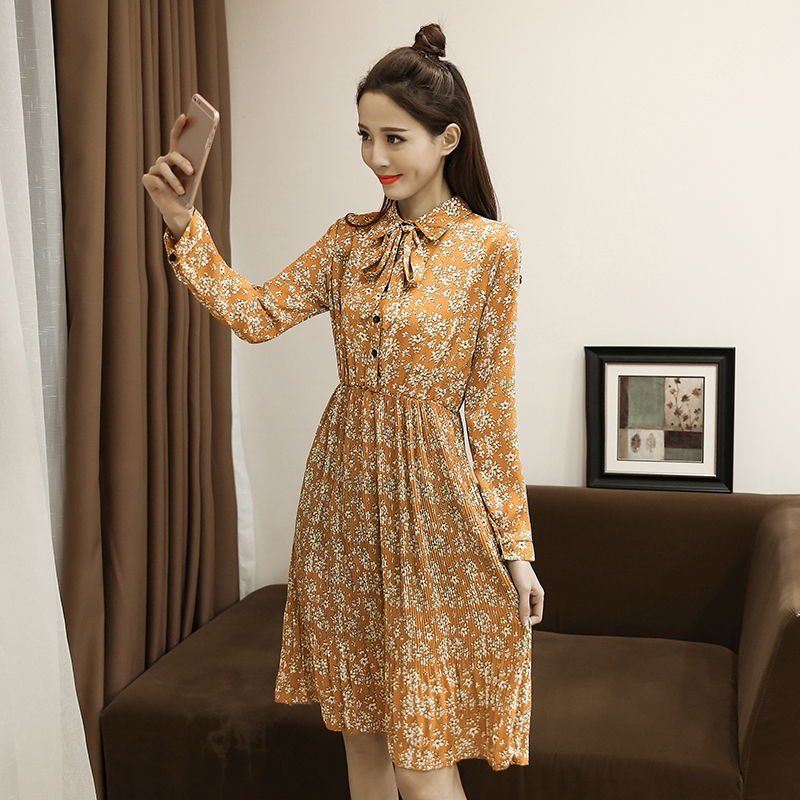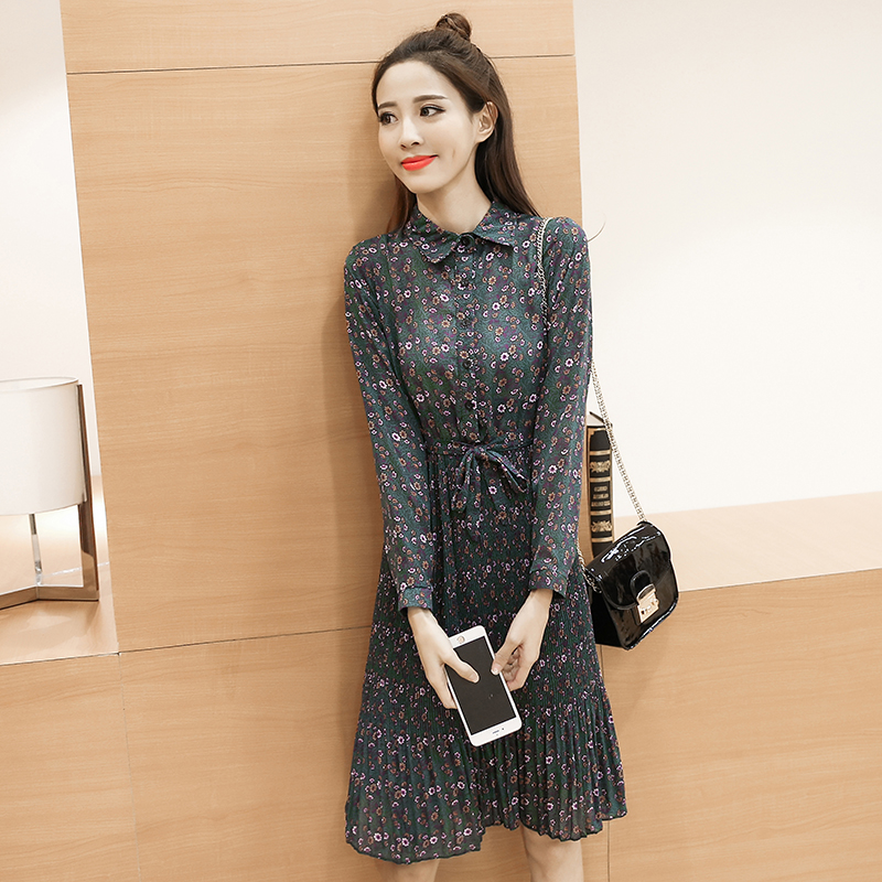 春新款女裝復古印花中長款襯衫裙修身雪紡碎花長袖連衣裙秋冬