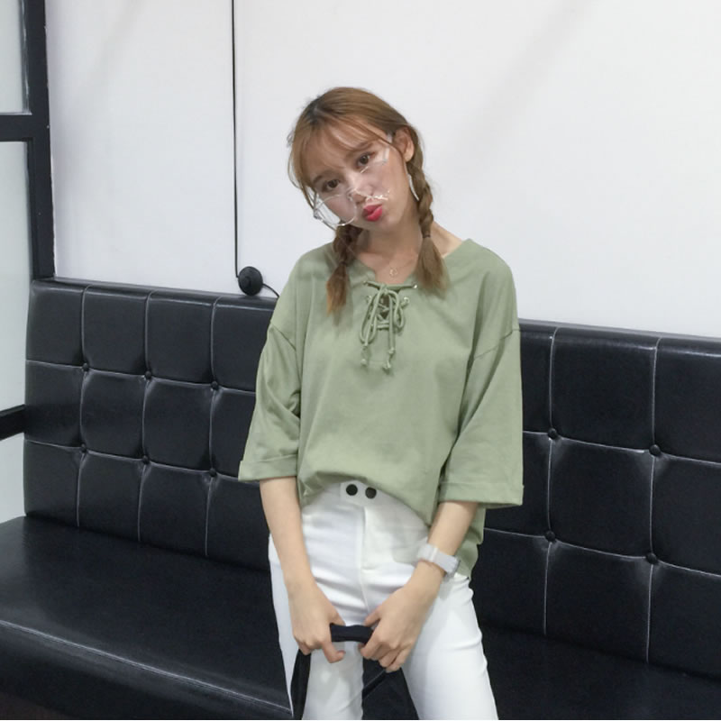 沒有過多繁瑣復雜的修飾 最大的亮點在領口 V領設計 金屬圓形穿孔綁帶