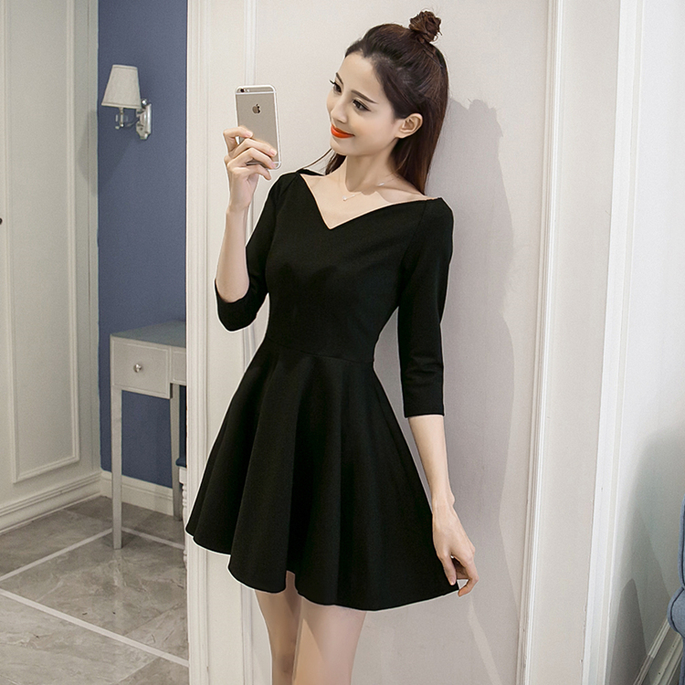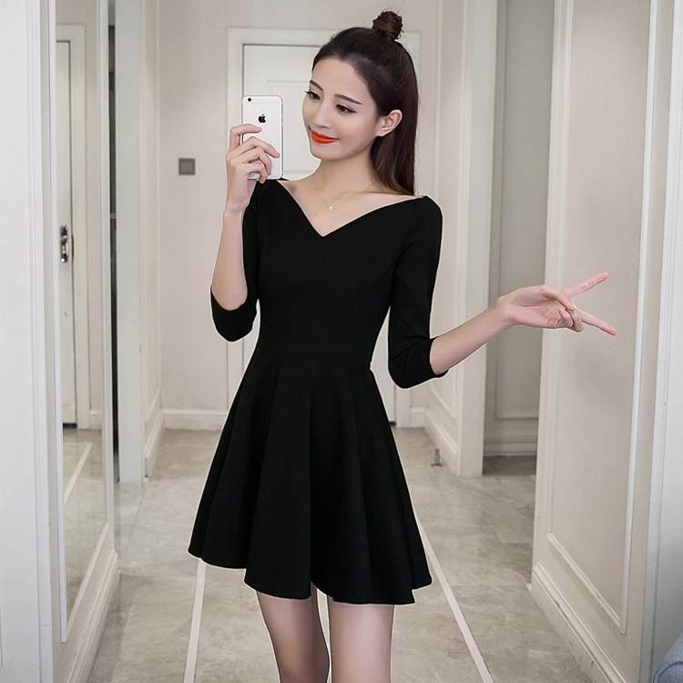 春秋裝新款女裝復古赫本小黑裙修身顯瘦七分袖V領蓬蓬連衣裙