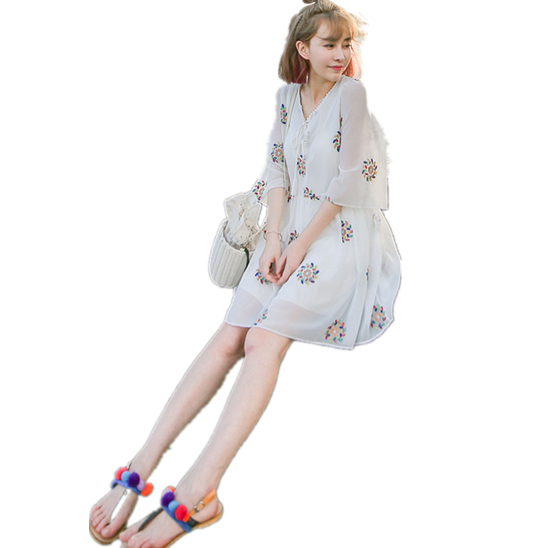新款波西米亞短裙沙灘裙海邊度假刺繡連衣裙夏小清新雪紡裙子