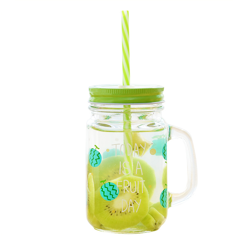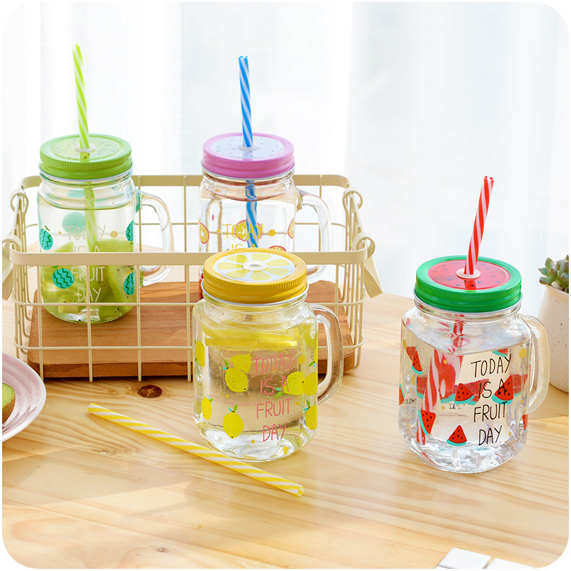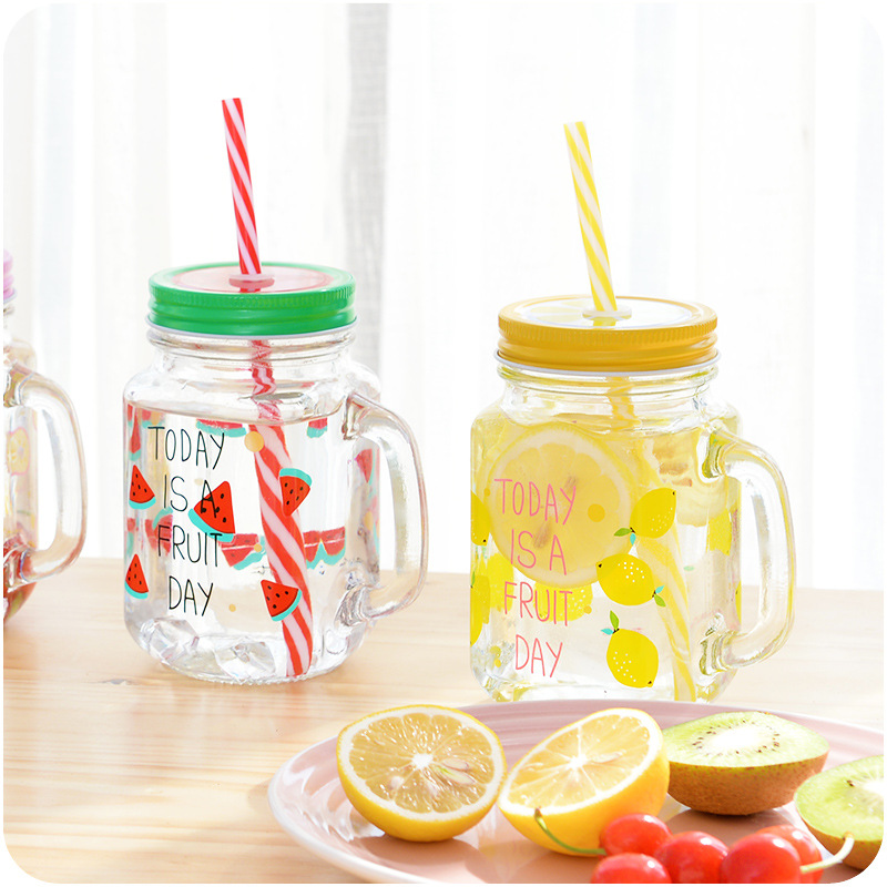 創意水果印花透明果汁飲料玻璃杯帶蓋帶吸管可愛冷水牛奶檸檬杯子