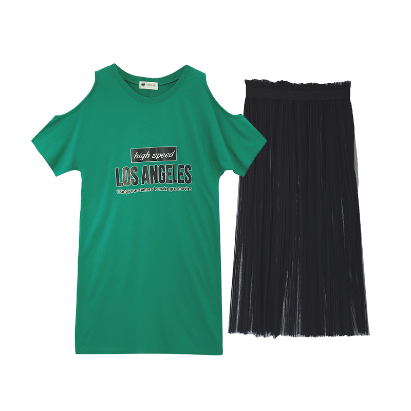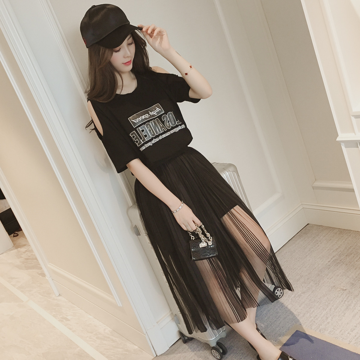 夏季新款韓版寬松大碼短袖t恤連衣裙女網紗半身裙兩件套裝裙