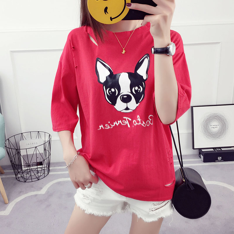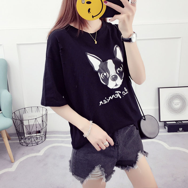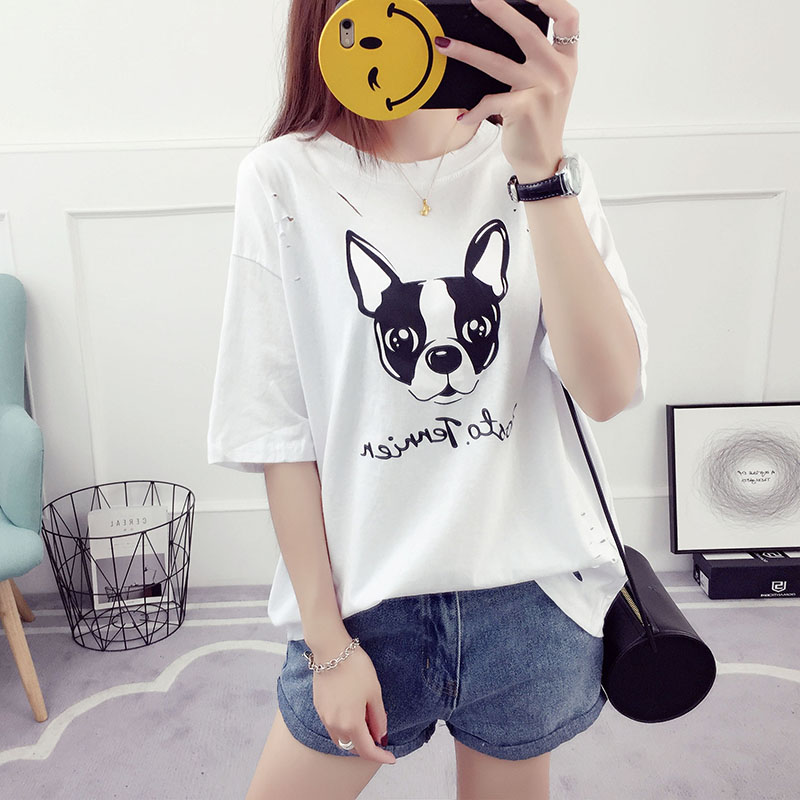 / 新款夏裝韓版潮學生百搭寬松破洞t恤女短袖卡通半袖休閑顯瘦