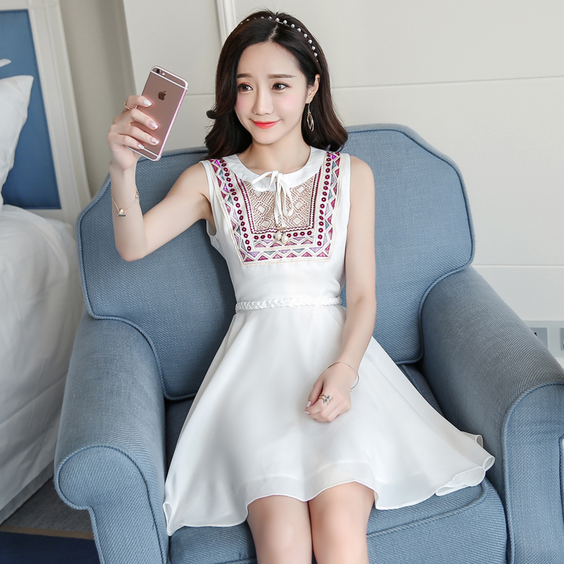 新款女裝復古名族風刺繡高腰背心裙中長款修身無袖連衣裙女夏
