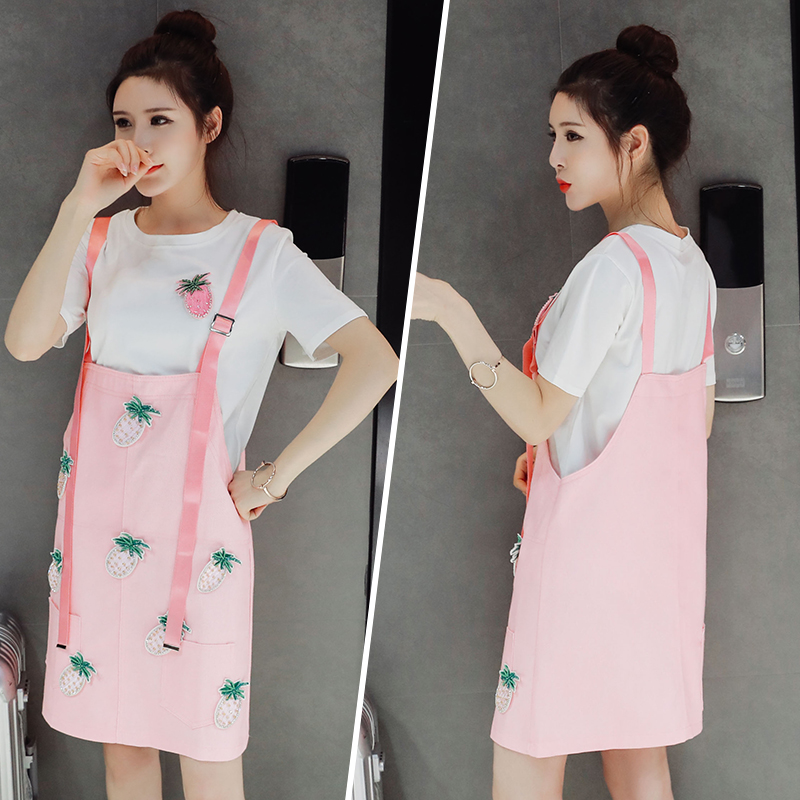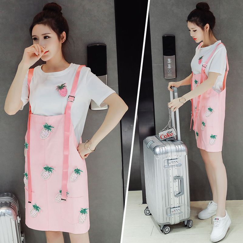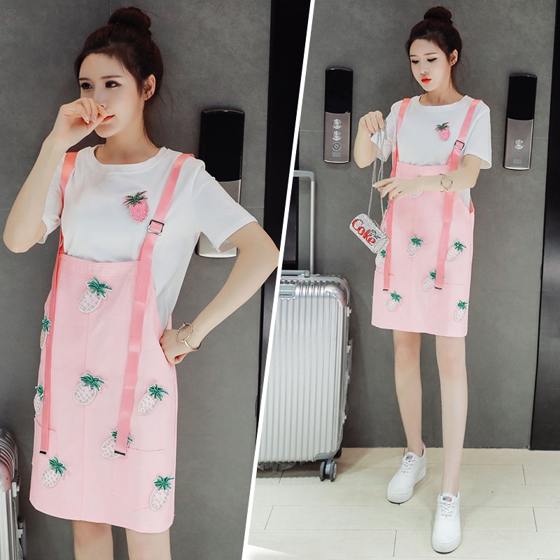 / 歐美夏裝T恤休閑兩件套新款寬松減齡學生連衣裙女背帶裙套裝