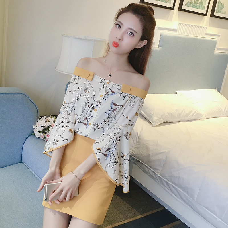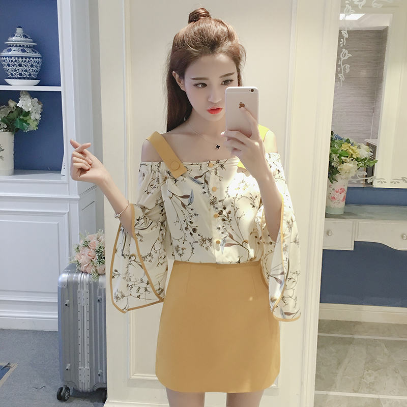 / 夏季韓版名媛氣質一字肩吊帶雪紡上衣兩件套女休閑半身短裙套裝潮