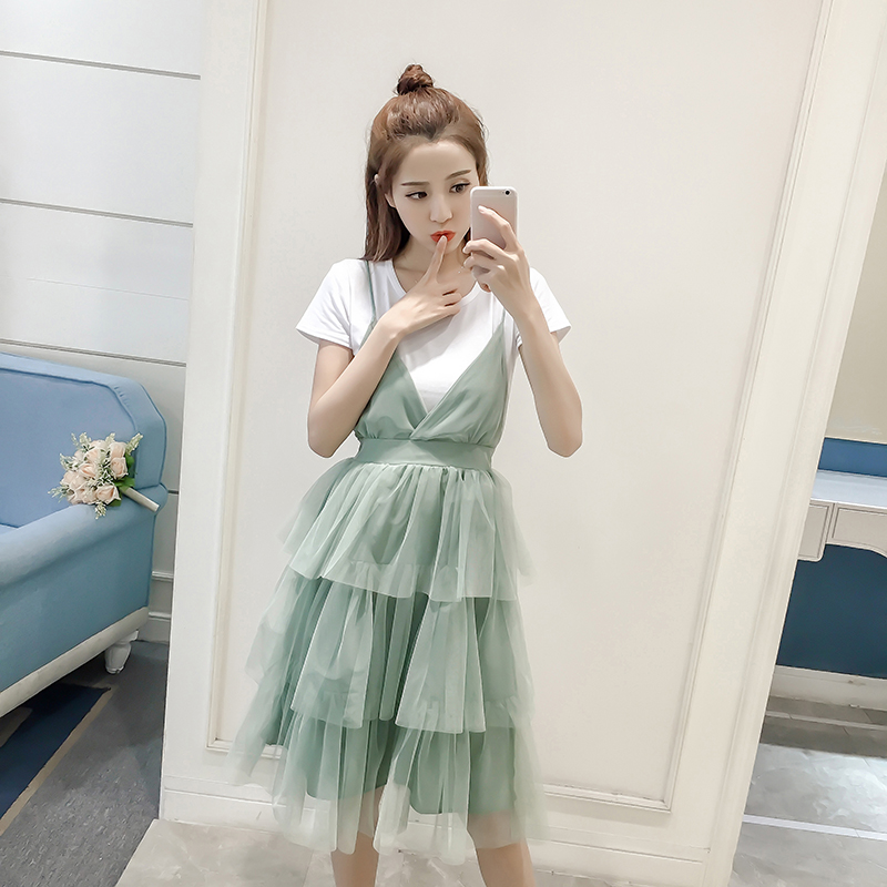/ 夏季新款女裝韓版網紗吊帶裙兩件套中長款顯瘦短袖蓬蓬連衣裙