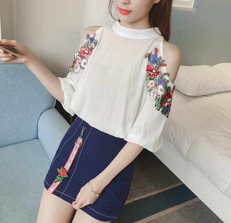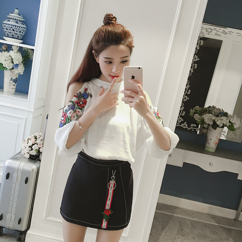 春夏新款女裝韓版時尚露肩雪紡衫兩件套女高腰半身短裙休閑套裝潮