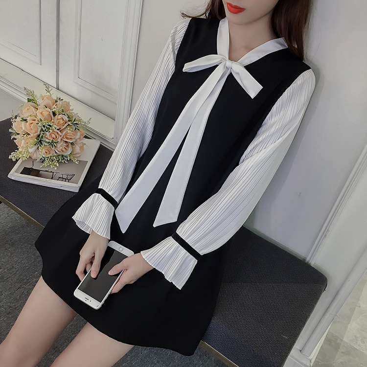 / 春裝新款女裝學院風拼接打底裙秋冬大碼顯瘦長袖雪紡連衣裙子