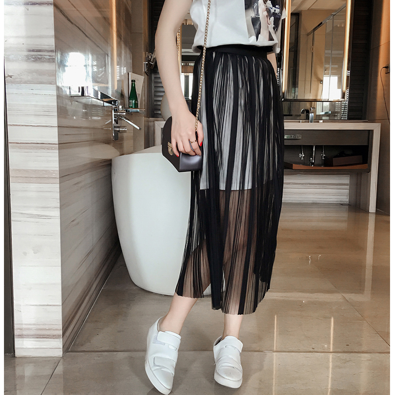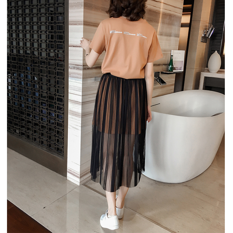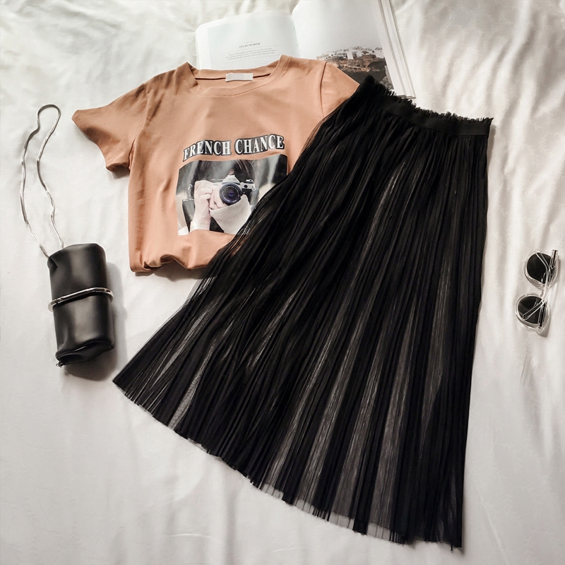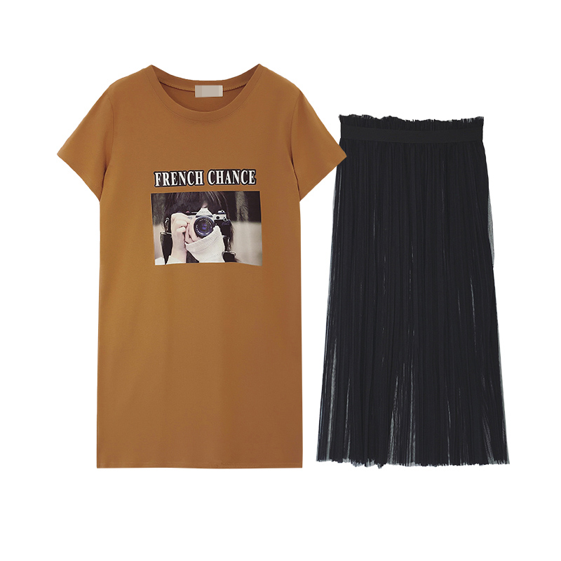 / 春夏新款韓版中長印花短袖t恤連衣裙套裝女透視網紗半身裙兩件套