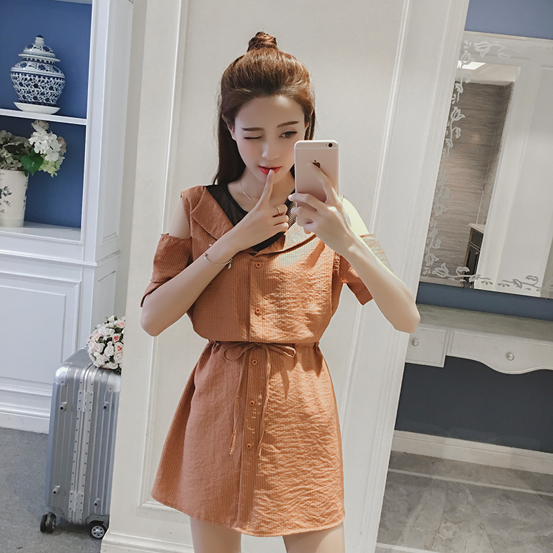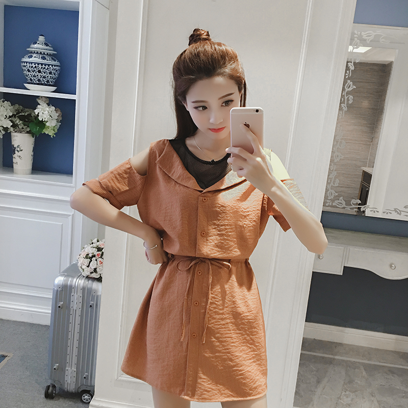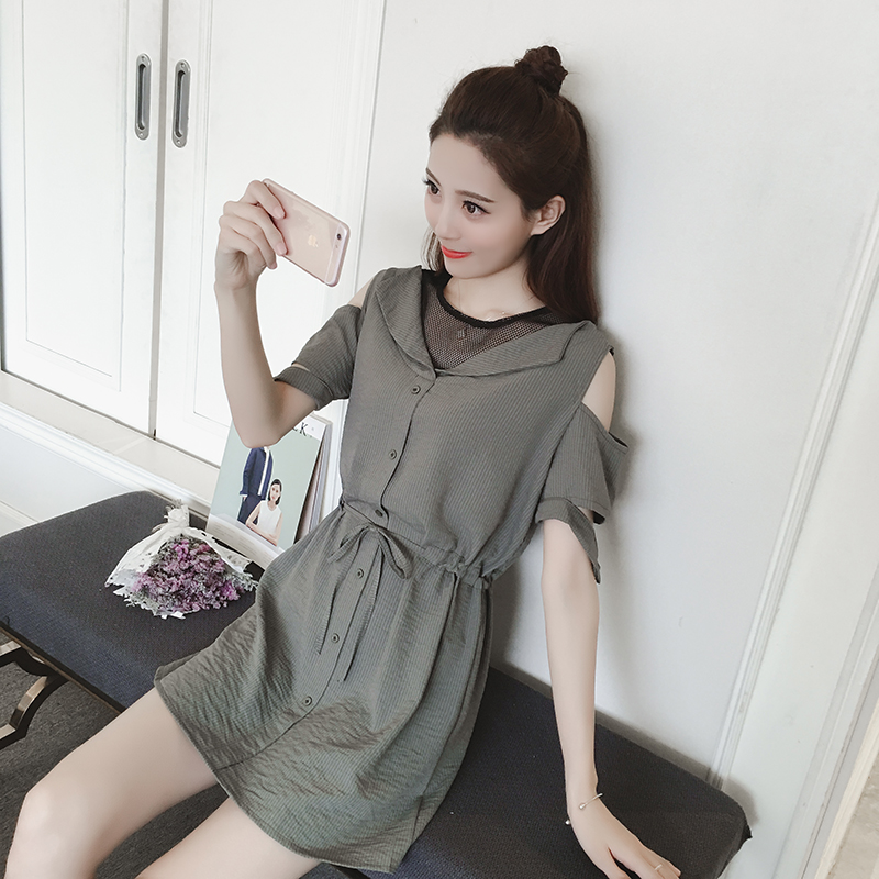/ 夏季新款女裝韓版時尚網紗拼接打底裙寬松顯瘦短袖露肩連衣裙