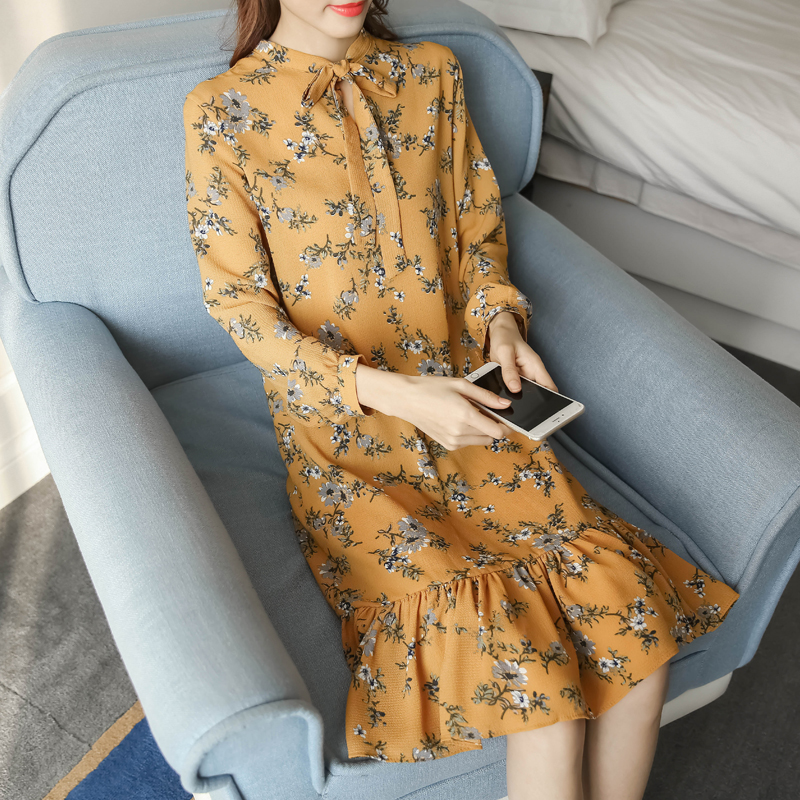 / 春新款女裝復古印花中長款魚尾裙顯瘦碎花雪紡長袖連衣裙春秋