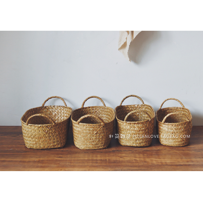 樸簡 日式手工海草編筐雙耳收納籃 桌面雜物籃整理儲物筐子