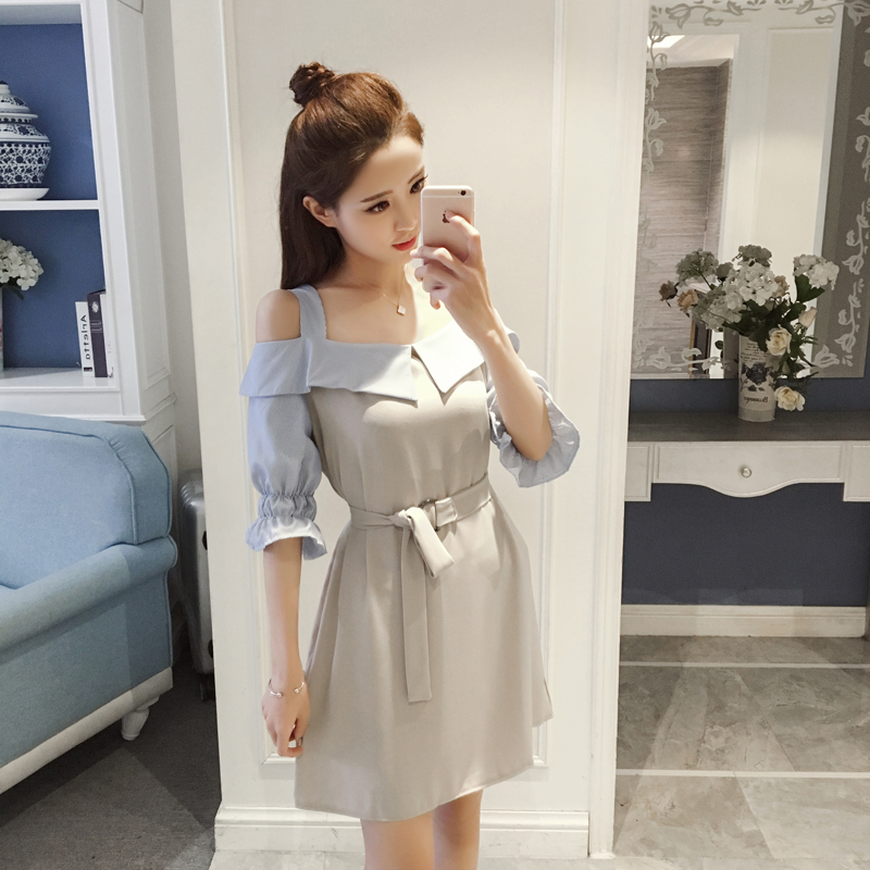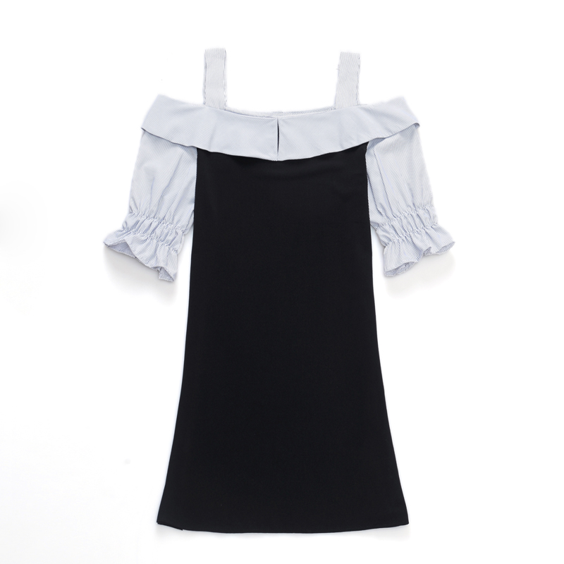 / 春夏季新款女裝韓版一字領拼色喇叭袖修身露肩吊帶中袖連衣裙